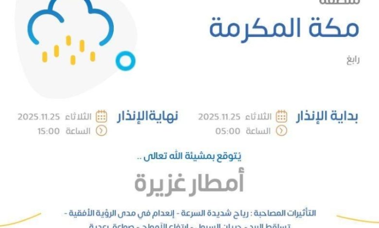توقع المركز الوطني للأرصاد الجوية هطول أمطار غزيرة على محافظة رابغ في منطقة مكة المكرمة، مع رياح شديدة وانعدام في الرؤية الأفقية.