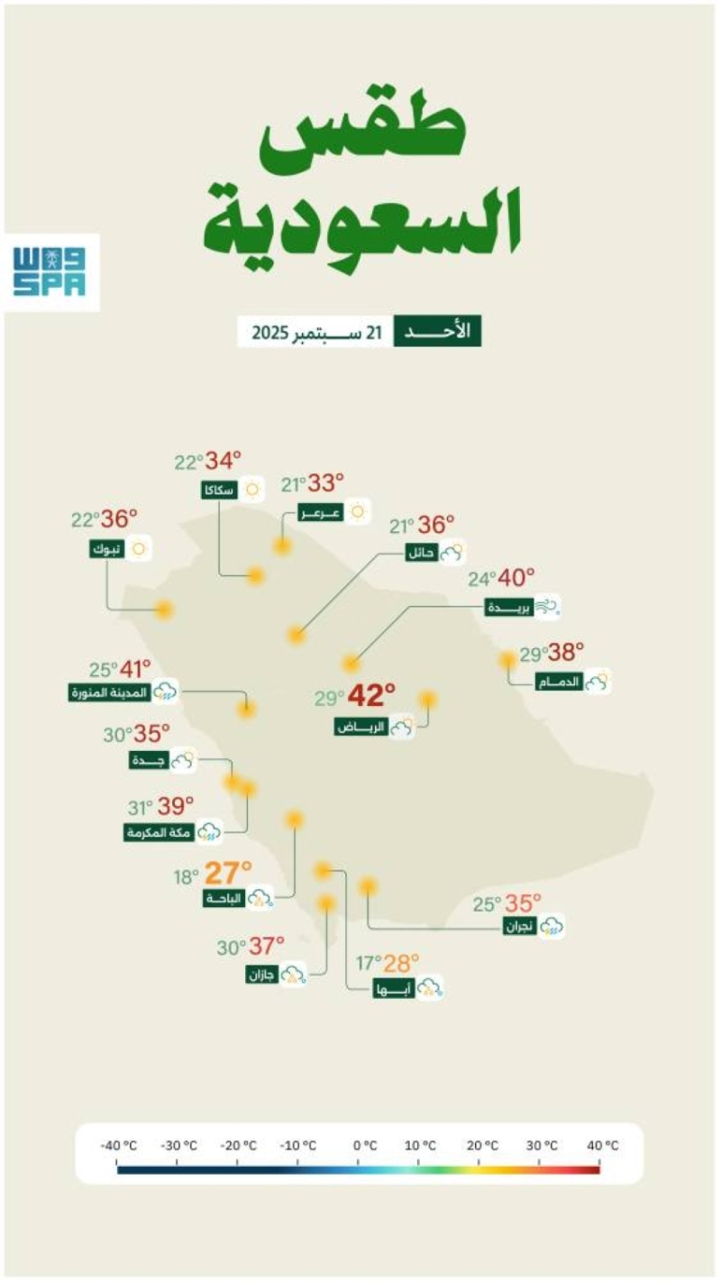 توقع المركز الوطني للأرصاد في تقريره عن حالة الطقس اليوم استمرار هطول أمطار رعدية متوسطة إلى غزيرة في عدة مناطق بالمملكة العربية السعودية. ومن المناطق المتأثرة جازان، عسير، الباحة، مكة المكرمة، المدينة المنورة، حيث من المتوقع أن تتسبب الأمطار الغزيرة في جريان السيول، مع زخات من البرد ورياح نشطة تثير الأتربة والغبار.