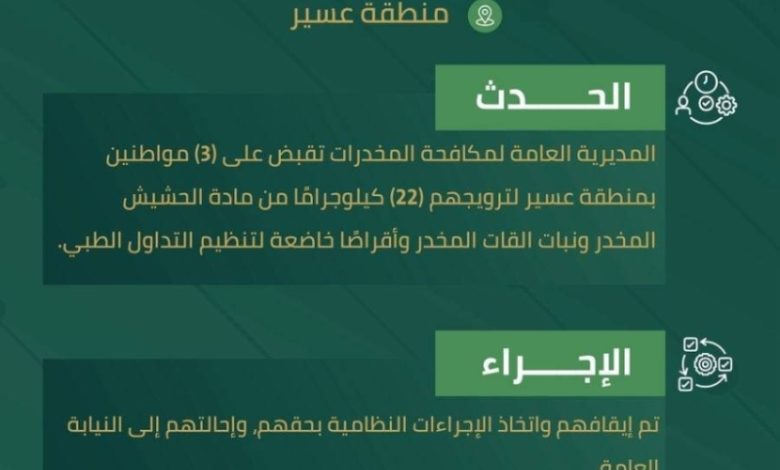 القبض على ثلاثة أشخاص في منطقة عسير بتهمة ترويج المواد المخدرة