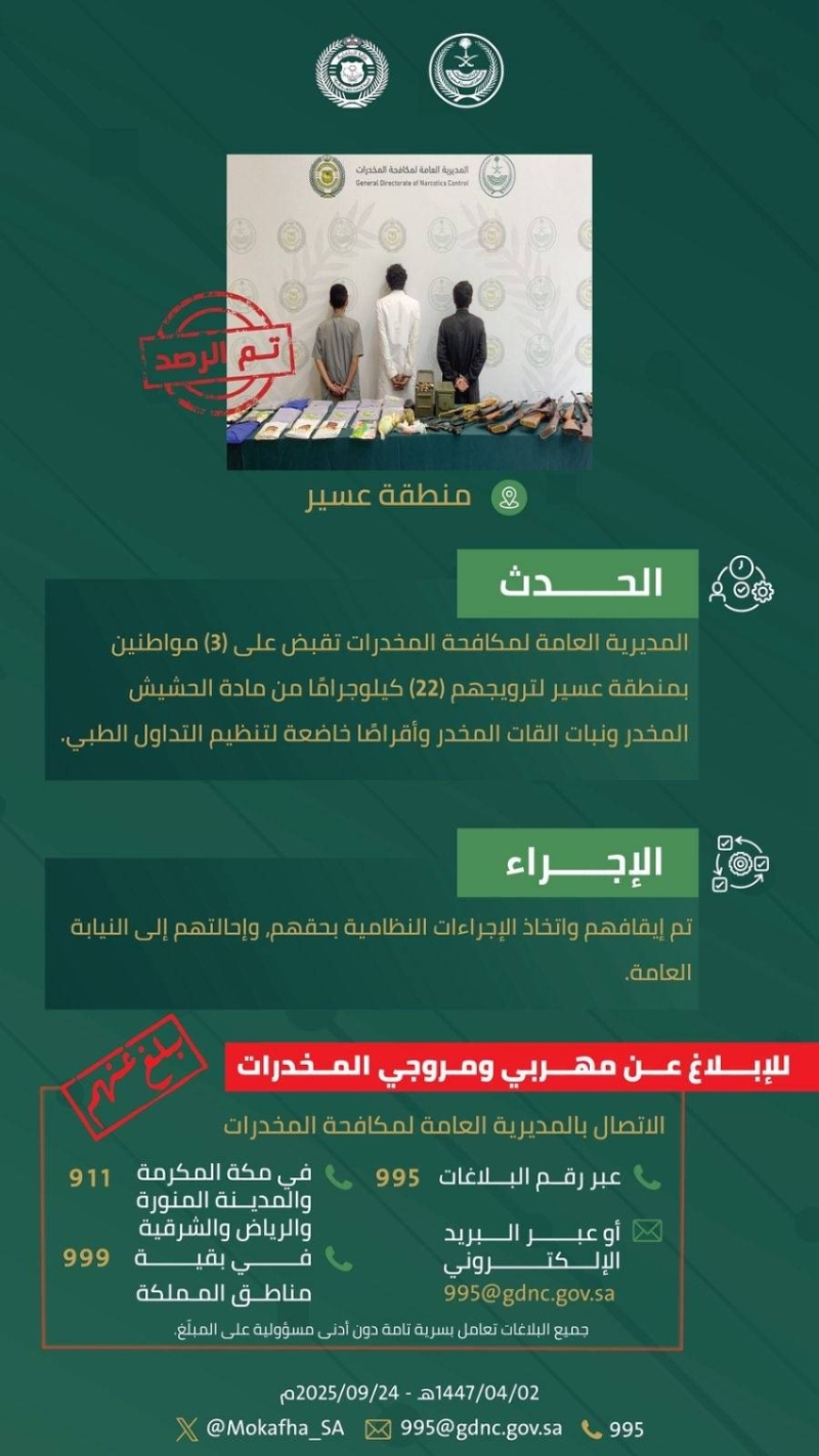 القبض على ثلاثة أشخاص في منطقة عسير بتهمة ترويج المواد المخدرة