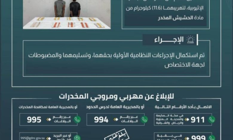 القبض على مخالفين في جازان بتهريب 11.6 كجم من الحشيش