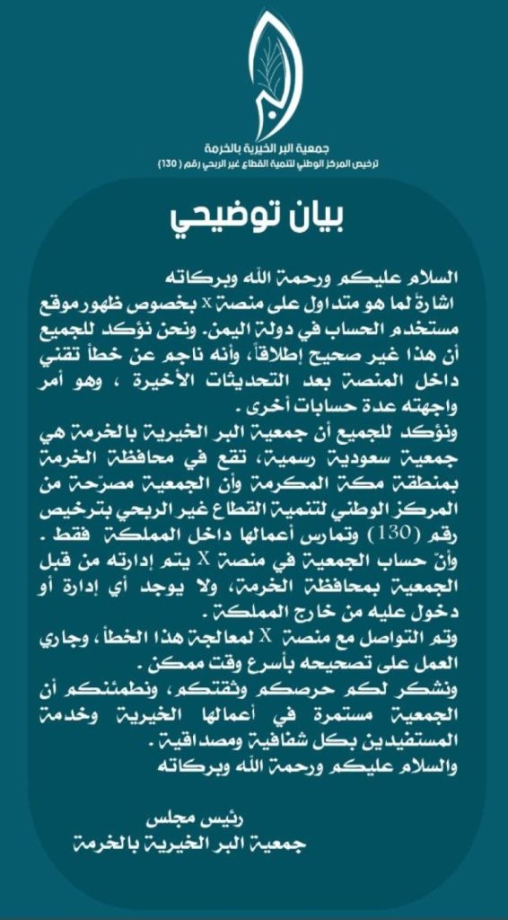 جمعية البر الخيرية بالخرمة: توضح الحقيقة وتؤكد على سلامة حسابها أكدت جمعية البر الخيرية في محافظة الخرمة أن حسابها على