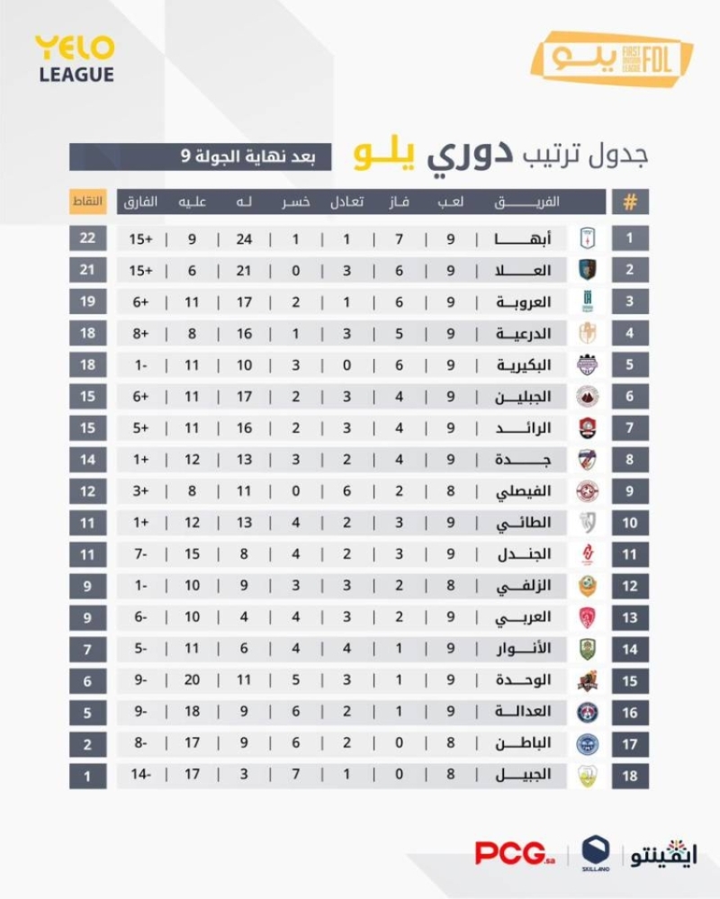 أبها يتصدر الترتيب بعد انتهاء الجولة التاسعة من دوري يلو فوز كبير لأبها يرفعه للصدارة العلا يتراجع للمركز الثاني بعد