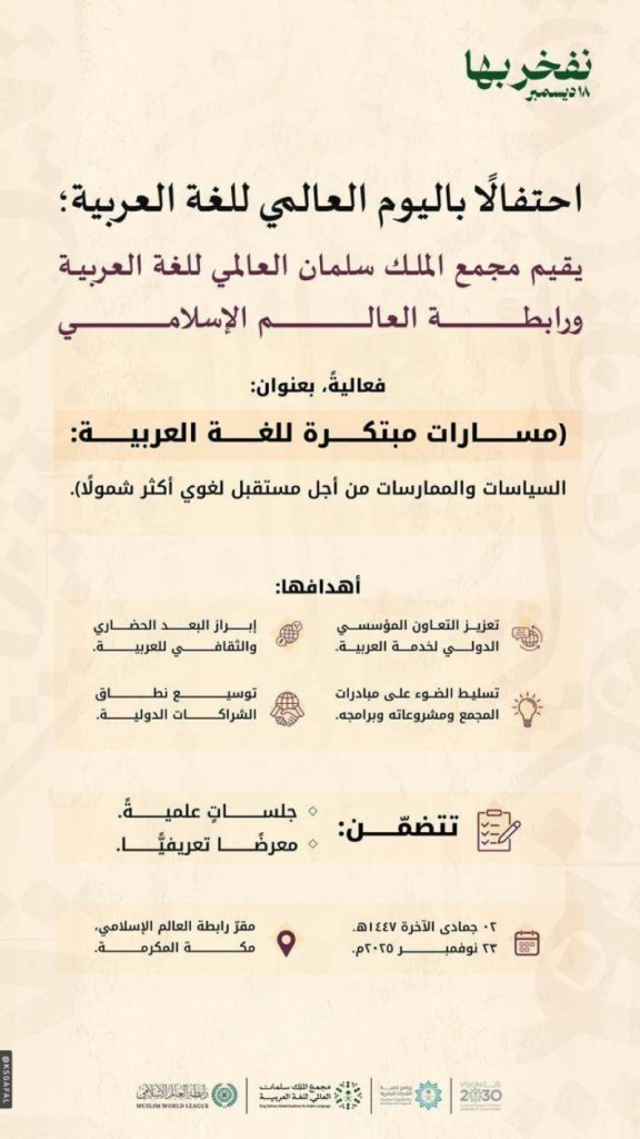 مجمع الملك سلمان ورابطة العالم الإسلامي يحتفلان باليوم العالمي للغة العربية تستعد مدينة مكة المكرمة لاحتضان فعالية خاصة بمناسبة اليوم