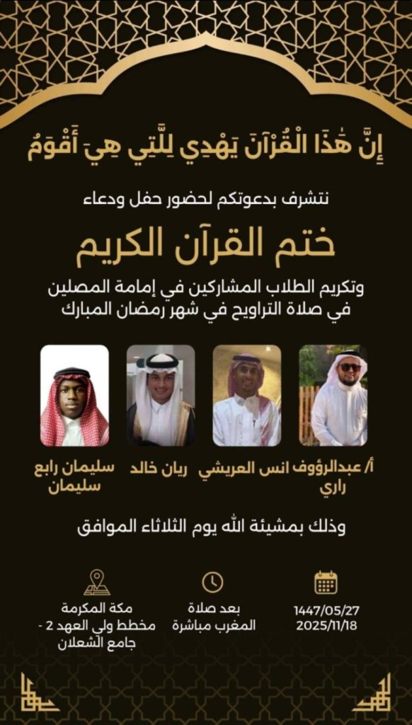 تكريم أربعة طلاب في جامع الشعلان بمكة المكرمة يوم الثلاثاء المقبل، ستكون لحلقات تحفيظ القرآن الكريم بجامع الشعلان في مخطط