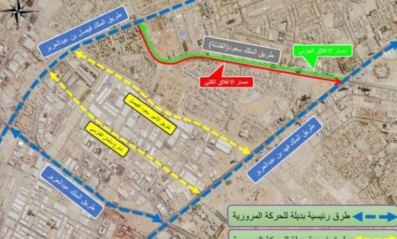 وسيتم إغلاق الطريق الرئيسي كليا بين طريق الملك فيصل بن عبدالعزيز (الساحلي) وطريق الملك فهد بن عبدالعزيز، وذلك لضمان سلامة المارة وسهولة سير الأعمال.