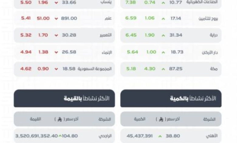 فيما كانت أسهم شركات الأهلي، وأمريكانا، والإنماء، والراجحي، وأرامكو السعودية، هي الأكثر نشاطًا بالكمية، وكذلك بالقيمة.