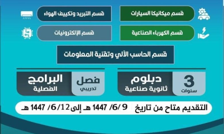المعهد الصناعي الثانوي بالباحة يعلن عن فتح باب القبول للفصل التدريبي الثاني