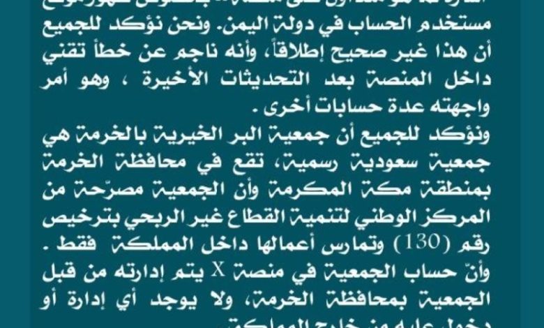 أكدت جمعية البر الخيرية في محافظة الخرمة أن حسابها على منصة X يدير من محافظة الخرمة وأنه لا علاقة له بالخطأ التقني الذي تم تداوله على مواقع التواصل الاجتماعي. تم تداول معلومات خاطئة تفيد بأن حساب الجمعية يدير من الجمهورية العربية اليمنية بسبب تحديث جديد.