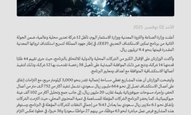 التأهيل الاستكشافي: 12 شركة تعدين تأهلت لتنفيذ أعمال استكشاف بقيمة 9.4 تريليون ريال
