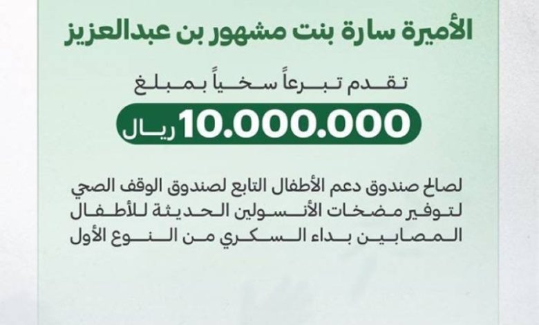بمبلغ 10 ملايين ريال، قدَّمت حرم ولي العهد، الأميرة سارة بنت مشهور بن عبدالعزيز، تبرعًا سخيًا لصندوق دعم الأطفال المصابين بداء السكري من النوع الأول. الهدف من هذا التبرع الكريم هو تمكين الأطفال المصابين من الحصول على أحدث وسائل الرعاية والعلاج.