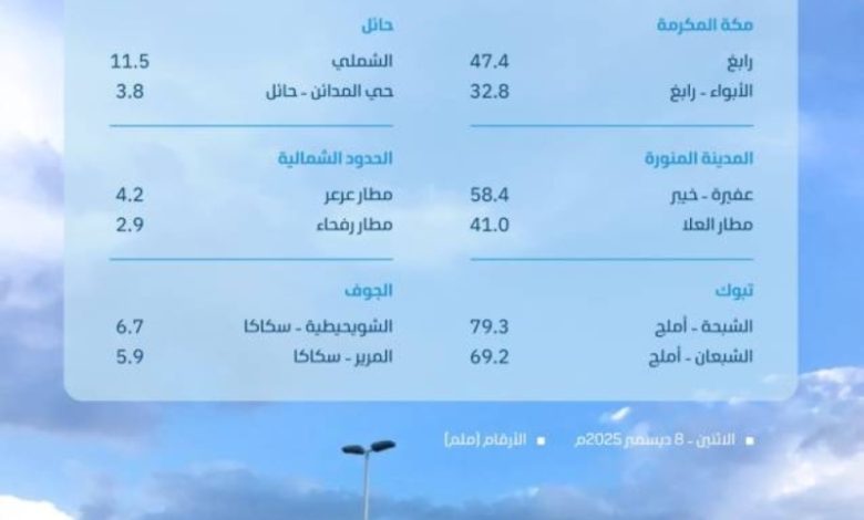 وفي مناطق أخرى من المملكة، سجلت مكة المكرمة هطول 47.4 ملم في رابغ، والمدينة المنورة 58.4 ملم في عفيرة – خيبر. وفي منطقة حائل سجلت 11.5 ملم في محطة الشملي.