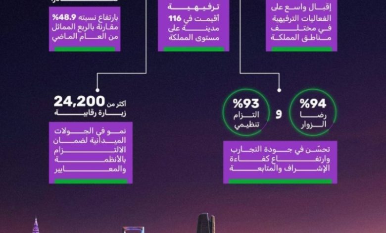 أما فيما يتعلق بالرقابة، فزاد عدد الزيارات الرقابية إلى أكثر من 24,200 زيارة بارتفاع نسبته حوالي 4%، مما يعكس التزام الأنشطة الترفيهية بالأنظمة والمعايير المعتمدة.