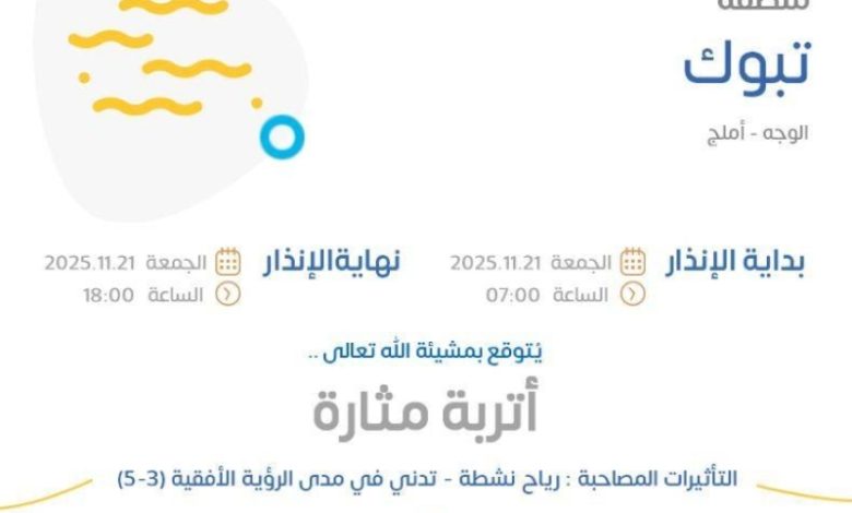 تبوك- تنبيه من المركز الوطني للأرصاد حذر اليوم سكان منطقة تبوك وأملج من تأثيرات الأتربة المثارة التي تصاحبها رياح نشطة وتدني في مدى الرؤية الأفقية، حيث من المتوقع أن تصل سرعة الرياح إلى مستويات عالية تصل إلى 5 كم في الساعة.
