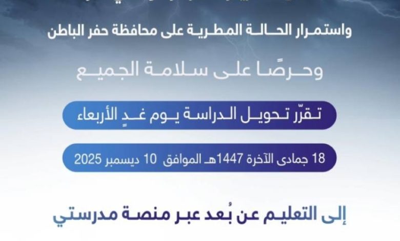 تأتي هذه الخطوة نتيجة استمرار الحالة المطرية التي تشهدها محافظة حفر الباطن، حيث يُعتبر تحويل الدراسة إلى التعليم عن بُعد إجراء احترازي لضمان سلامة الطلاب والمعلمين.