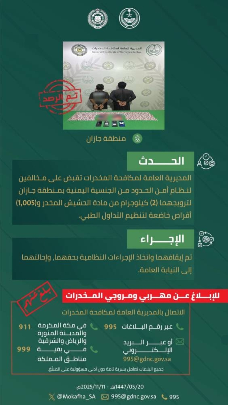 ضبطت الجهات الأمنية في منطقة جازان مخالفين من الجنسية اليمنية لترويجهما مادة الحشيش المخدر وأقراصًا خاضعة لتنظيم التداول الطبي.