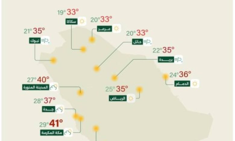 أما حالة الرياح السطحية في الخليج العربي، فستكون شمالية غربية إلى غربية بسرعة تتراوح بين 15-32 كم/ساعة، مع ارتفاع الموج من نصف المتر إلى متر ونصف وحالة البحر خفيفة إلى متوسطة الموج.