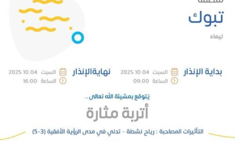 أصدر المركز الوطني للأرصاد في منطقة تبوك تحذيرًا اليوم من تأثيرات الأتربة المثارة على محافظة تيماء، حيث تصاحبها رياح نشطة وتدني في مدى الرؤية الأفقية يصل إلى 3-5 كيلومترات.