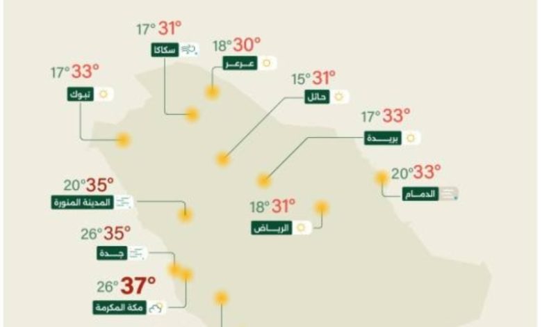 ومن المتوقع أيضًا تكون الضباب على بعض تلك المناطق وعلى أجزاء من المنطقة الشرقية. وتشير التقارير إلى أن حركة الرياح ستكون متغيرة خلال اليوم، حيث تكون شمالية غربية على الجزء الشمالي والأوسط، وجنوبية إلى جنوبية شرقية على الجزء الجنوبي.