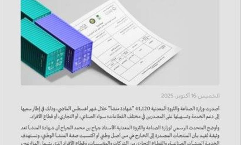 وزارة الصناعة والثروة المعدنية تصدر أكثر من 41 ألف شهادة منشأ خلال شهر أغسطس