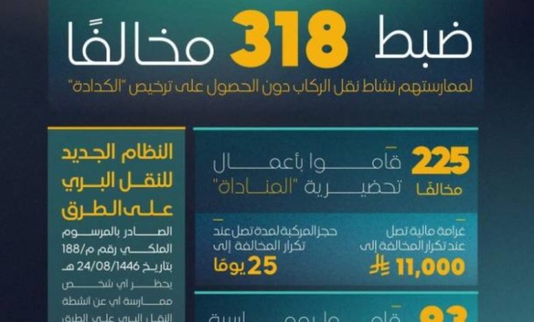 وفي سياق آخر، ذكرت الهيئة أن النظام الجديد للنقل البري على الطرق، الذي صدر بالمرسوم الملكي رقم (م/188)، يحظر ممارسة النقل دون تراخيص نظامية، وينص على غرامات مالية تصل إلى 11 ألف ريال مع حجز المركبة لمدة 25 يومًا لمن يقوم بالأعمال التحضيرية للنقل.