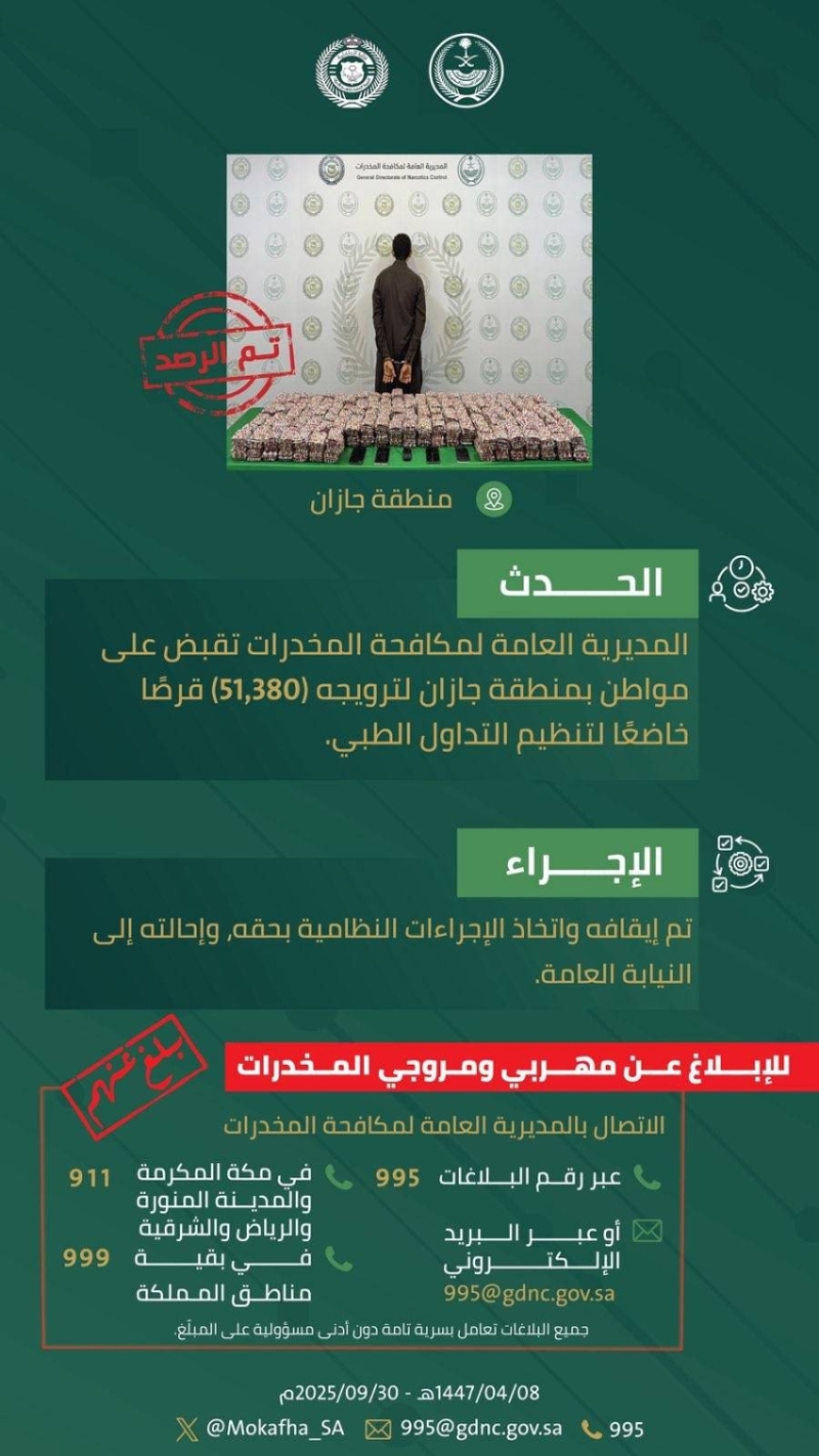 ضبط شخص في جازان بحوزته 51,380 قرصًا مخدرة في عملية مكافحة المخدرات