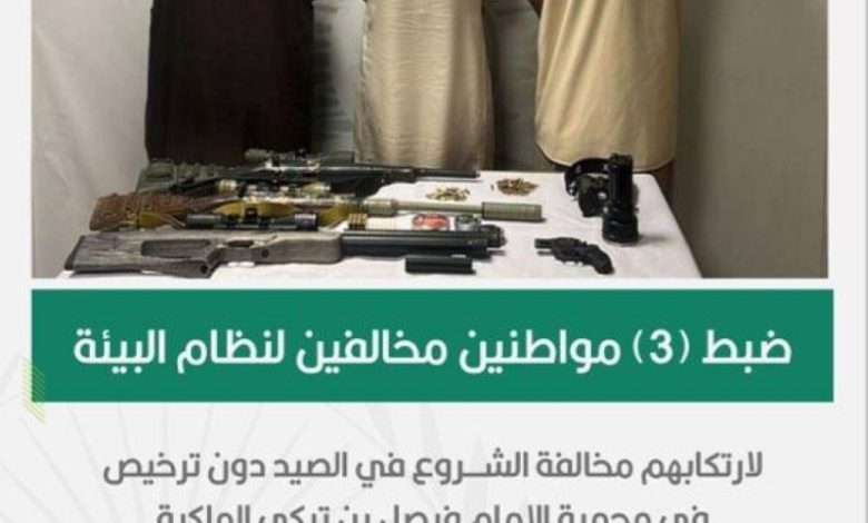 تمكنت القوات الخاصة للأمن البيئي من ضبط ثلاثة أشخاص لارتكابهم مخالفة الشروع في الصيد دون ترخيص في محمية الإمام فيصل بن تركي الملكية. وقد تم ضبطهم وبحوزتهم ثلاث بنادق هوائية و740 ذخيرة منوعة، وتم اتخاذ الإجراءات النظامية بحقهم.