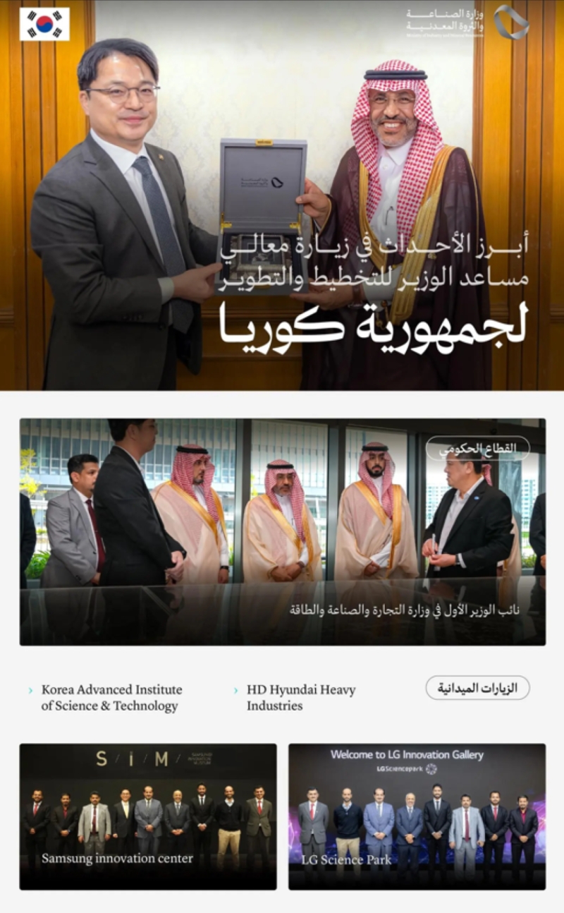 الدكتور عبدالله بن علي الأحمري، مساعد وزير الصناعة والثروة المعدنية للتخطيط والتطوير، قام بزيارة إلى جمهورية كوريا حيث التقى بعدد من المسؤولين الحكوميين وقادة القطاع الخاص. تم خلال الزيارة مناقشة سبل تعزيز التعاون الصناعي والفرص المشتركة في مجالات التصنيع المتقدم، والصناعات البحرية، والابتكار والأبحاث الصناعية، وتنمية رأس المال البشري.