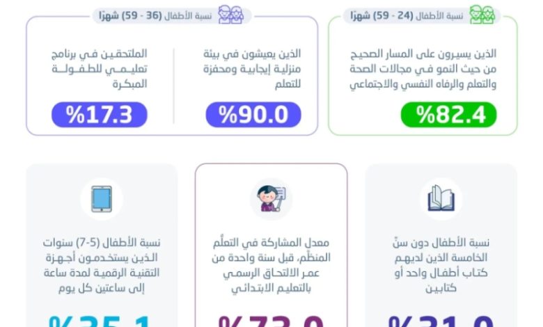 وأظهرت النتائج أن نسبة الإناث اللاتي يسرن على المسار الصحيح بلغت 83.2% مقارنةً بـ81.6% من الذكور، كما أن 90.0% من الأطفال في الفئة العمرية بين 36-59 شهرًا يعيشون في بيئة منزلية إيجابية ومحفِّزة للتعلُّم.