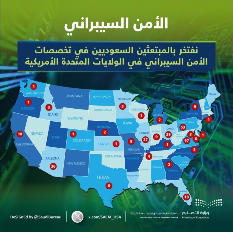 339 مبتعثًا سعوديًا يتخصصون في الأمن السيبراني في أكثر من 85 جامعة أمريكية لدعم تصدر المملكة العالمي في هذا المجال