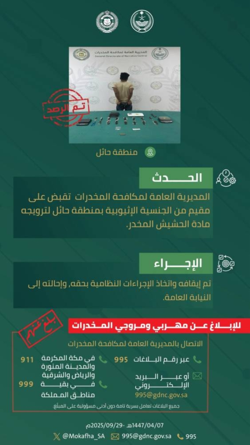 القبض على مقيم في حائل بتهمة ترويج مادة الحشيش