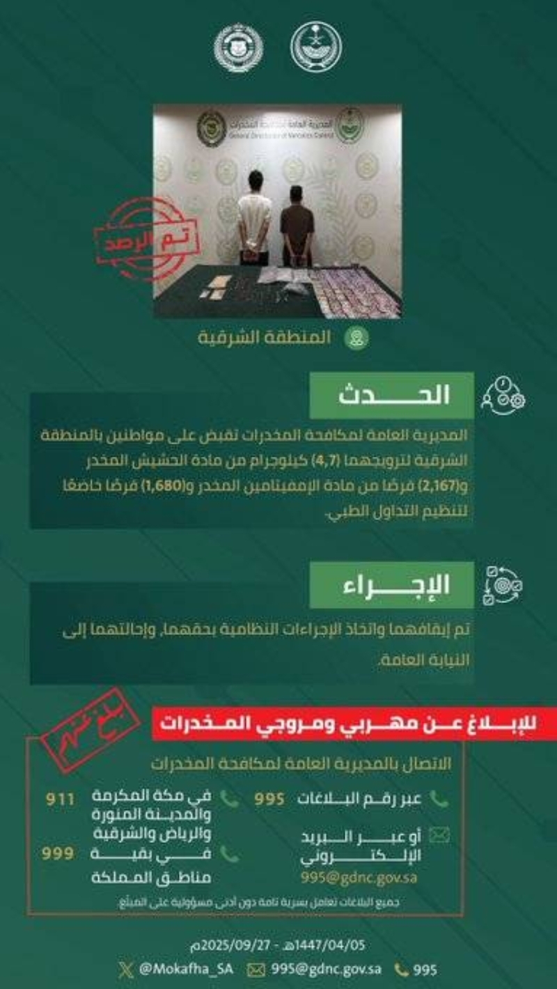 الشرطة في الشرقية تلقي القبض على مواطنين يروجون للمخدرات